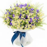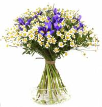 Необычное сочетание цветов в этом букете делает его очень оригинальным и уникальным. Насыщенно-фиолетовые ирисы, олицетворяющие на языке цветов отвагу и мужество, в сочетании с ярко-желтыми солидаго, создают невероятную контрастную композицию, а дополнительное украшение из зелени салала делает ее еще более насыщенной. Этот поистине джентельментский букет станет универсальным подарком на любой праздник или просто в обыденный день, а также поможет получателю забыть все обиды.