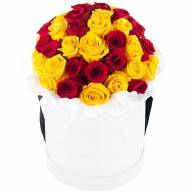 Эта коробка будет прекрасным подарком на юбилей или любой другой праздник. Такое сочетание роз напоминает солнечную осень.